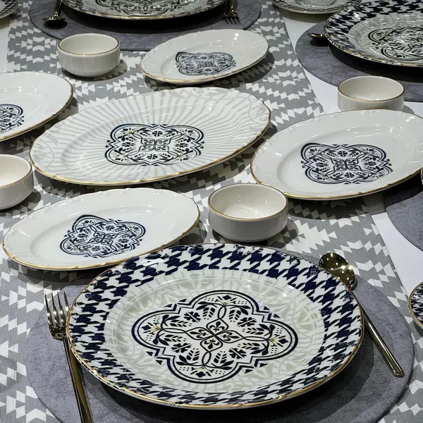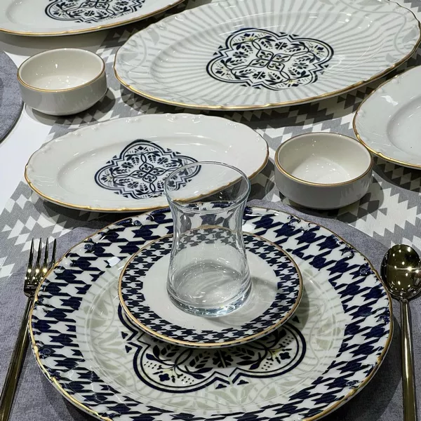 تمامی ظروف از پرسلن با کیفیت بالا ساخته شده و با آبکاری طلایی تزئین شدهاند.
