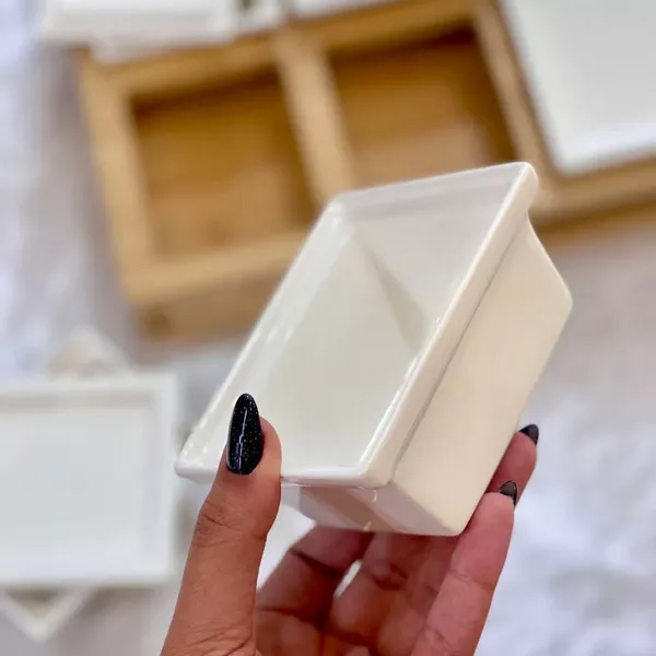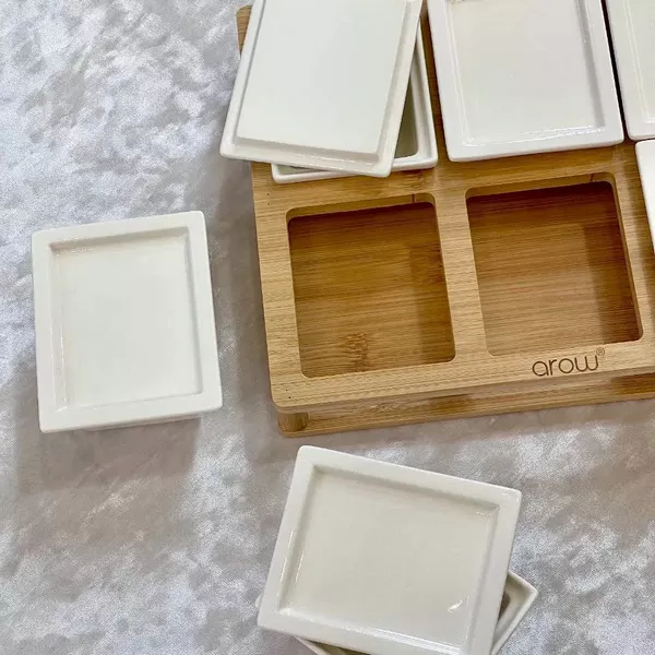 این ست شامل ۶ عدد پیاله پرسلن در ابعاد ۱۰×۸ سانتی‌متر با ارتفاع ۵ سانتی‌متر، ۶ عدد درب و ۱ عدد استند بامبو مقاوم می‌باشد.