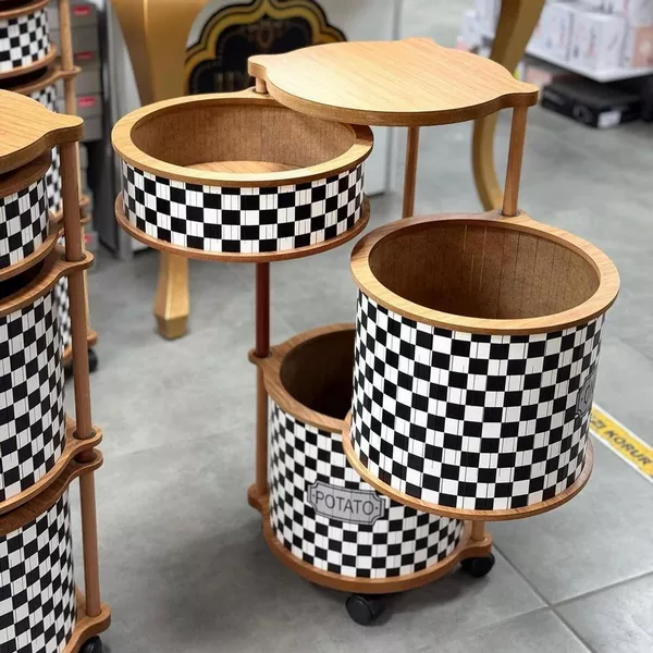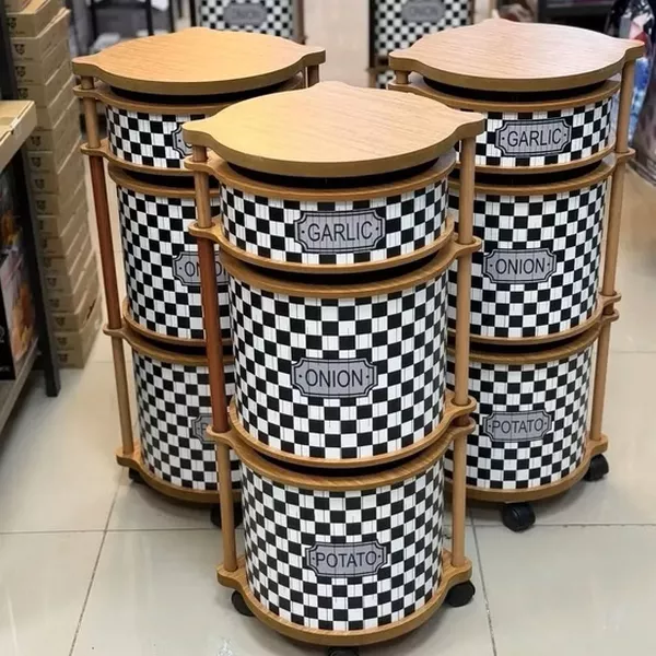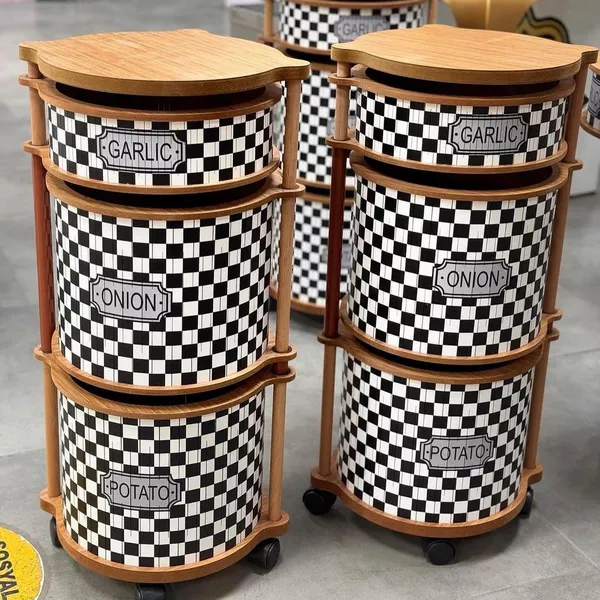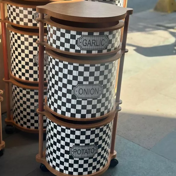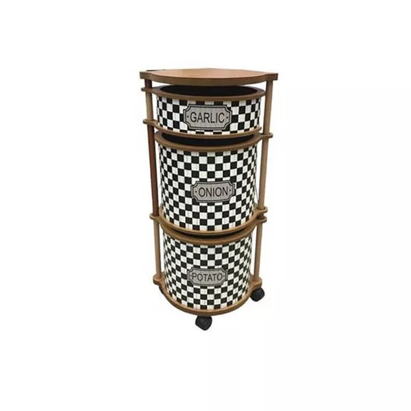سبد سیب‌زمینی و پیاز چند منظوره سه‌طبقه طرح شطرنجی چرخ‌دار یک محصول کاربردی و بسیار زیبا برای نظم‌دهی آشپزخانه است.
